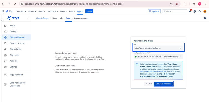 - Select Backup Snapshot for Destination: From the dropdown menu, choose the latest backup snapshot available for your destination site. This step is vital as it ensures you are working with the most current data from both environments.